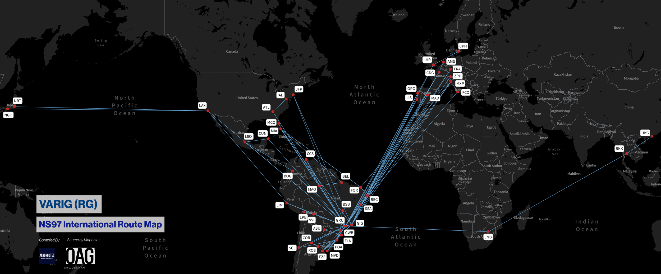 Today’s historical route map features VARIG’s international network during Northern summer 1997 season.