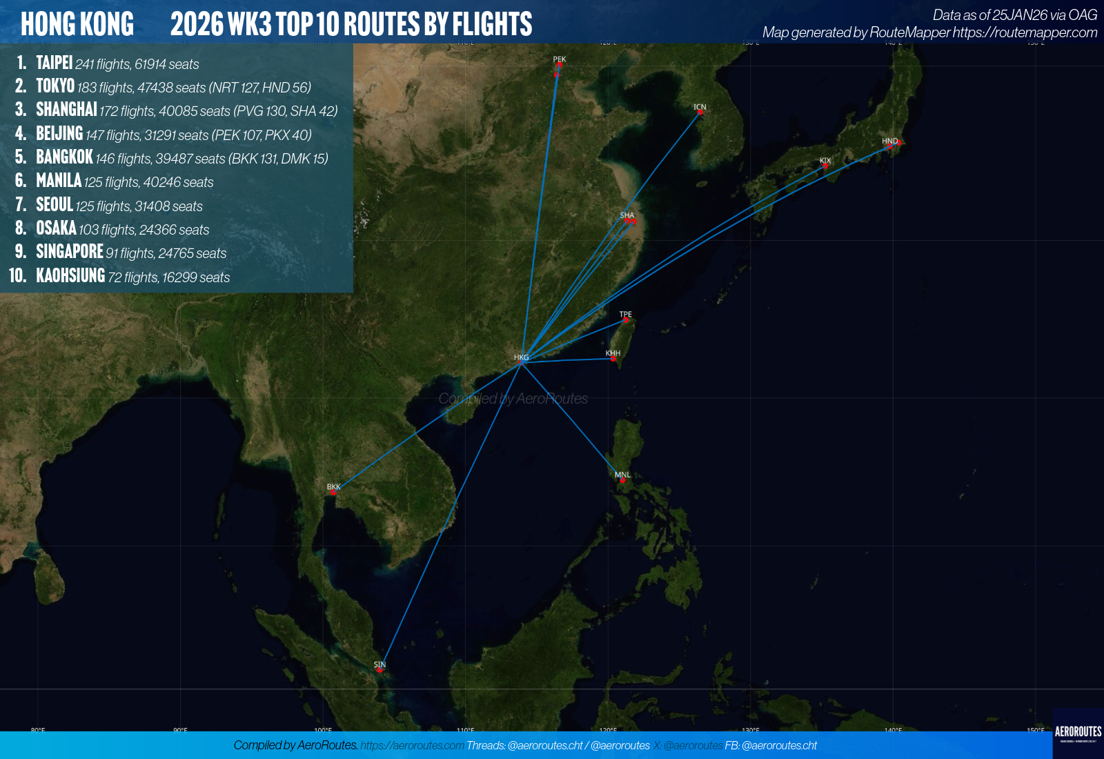 The following is a trivial post, focusing on Hong Kong’s Top 10 routes based on number of flights, based on calendar week 3 in 2026 (11-17JAN26). The ranking is based on data from OAG schedules analyser as of 25JAN26.