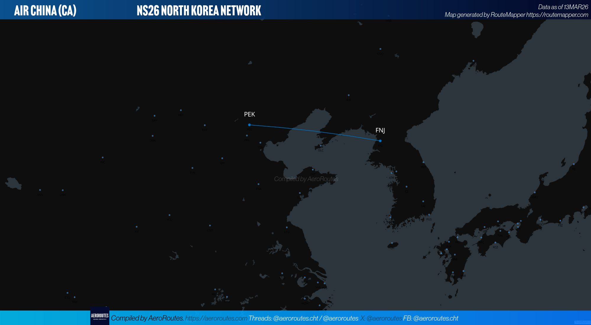 Air China on Friday 13MAR26 opened reservations to North Korea, last served until 2020. The Star Alliance member initially will resume Beijing Capital – Pyongyang flight on 30MAR26, with 737-700 aircraft operating once a week.