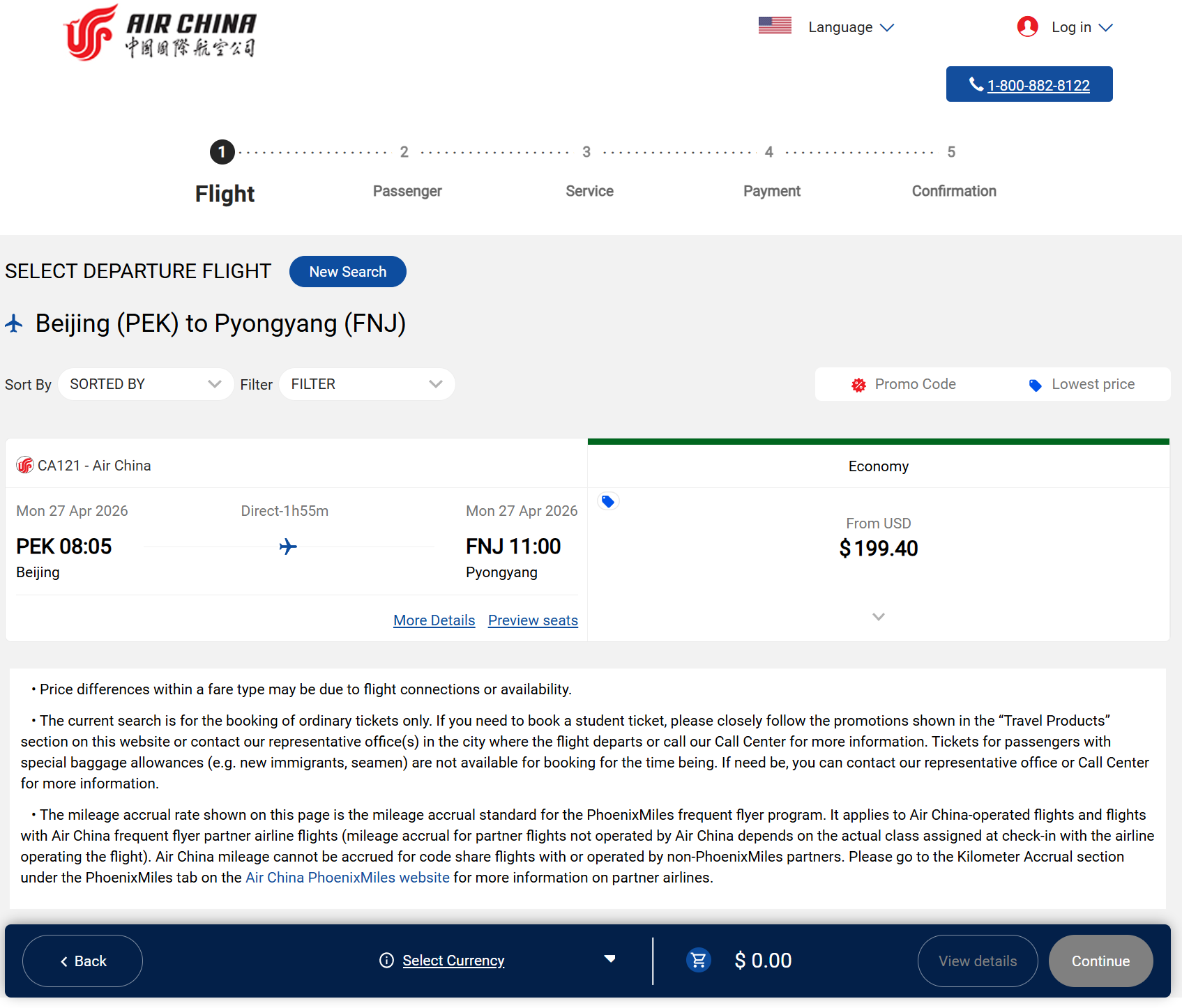 Despite the closure of booking, at time this post goes to press, Air China’s websites outside of China is showing flights available for reservations on 27APR26 (screenshot 1 below).